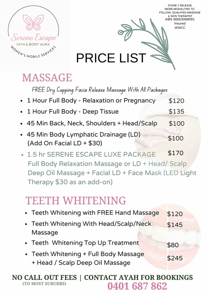 “Qualified Massage Therapist Also Available” visit sereneescape.com.au